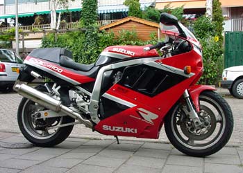 1989 kam das GSX-R 1100 Modell K, Typ GV 73 C auf den Markt. Beim Motor stieg der Hubraum auf 1.128 ccm, die Leistung wuchs auf ca. 138 PS, das Drehmomt lag in der 100 PS-Version bei 90 Nm, das aber schon bei 7.000 U/min an lag. Desweiteren gab es einen veränderten Rahmen, eine neue Teles- kopgabel und erstmals eine 4-2 Edelstahlauspuff- anlage. Desweiteren trug das neue Verkleidungs- design zu einer verbesserten Höchstgeschwindigkeit bei, die bei ca. 265 km/h lag. |